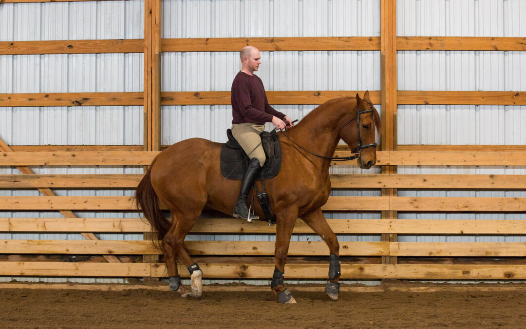 Man riding chestnut horse in indoor arena by Cody Harrison Cody Harrison riding Thoroughbred training horse Truck. First piaffe steps!